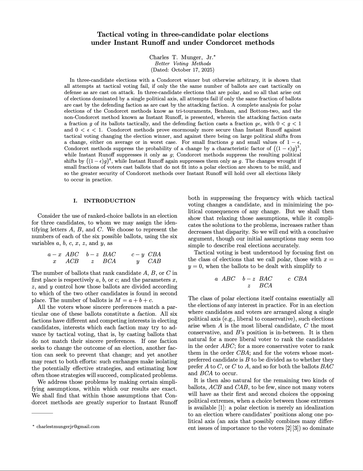 Summay: In three-candidate elections with a Condorcet winner but otherwise arbitrary, it is shown that all attempts at tactical voting fail, if only the the same number of ballots are cast tactically on defense as are cast on attack. In three-candidate elections that are polar, and so all that arise out of elections dominated by a single political axis, all attempts fail if only the same fraction of ballots are cast by the defending faction as are cast by the attacking faction. A complete analysis for polar elections of the Condorcet methods know as tri-touraments, Benham, and Bottom-two, and the non-Condorcet method known as Instant Runoff, is presented, wherein the attacking faction casts a fraction g of its ballots tactically, and the defending faction casts a fraction gϵ, with 0 < g < 1 and 0 < ϵ < 1. Condorcet methods prove enormously more secure than Instant Runoff against tactical voting changing the election winner, and against there being on large political shifts from a change, either on average or in worst case. For small fractions g and small values of 1 − ϵ, Condorcet methods suppress the probability of a change by a characteristic factor of (1 − ϵ)g 3, while Instant Runoff suppresses it only as g; Condorcet methods suppress the resulting political shifts by (1 − ϵ)g 4, while Instant Runoff again suppresses them only as g. The changes wrought if small fractions of voters cast ballots that do not fit into a polar election are shown to be mild, and so the greater security of Condorcet methods over Instant Runoff will hold over all elections likely to occur in practice.